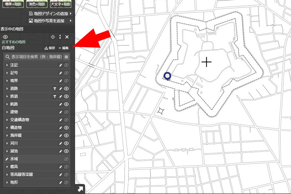各項目の右端にある目のようなアイコンをクリックすると、その項目の表示・非表示がリアルタイムで地図に反映されますので、作成する地図の利用用途に合った最適な状態に設定してみて下さい。