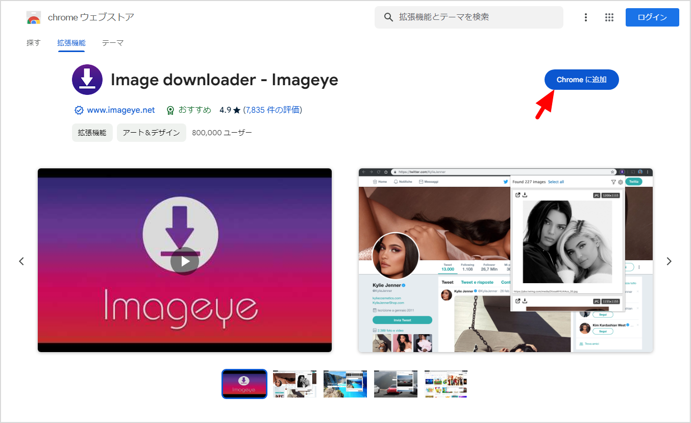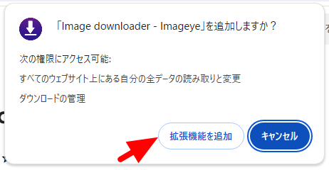 Image downloader - Imageyeの公開ページを開き、「Chromeに追加」(Edgeの場合は「インストール」)ボタンをクリックして拡張機能を追加して下さい。