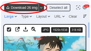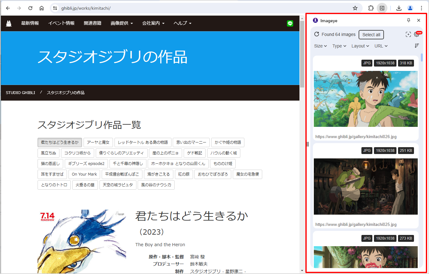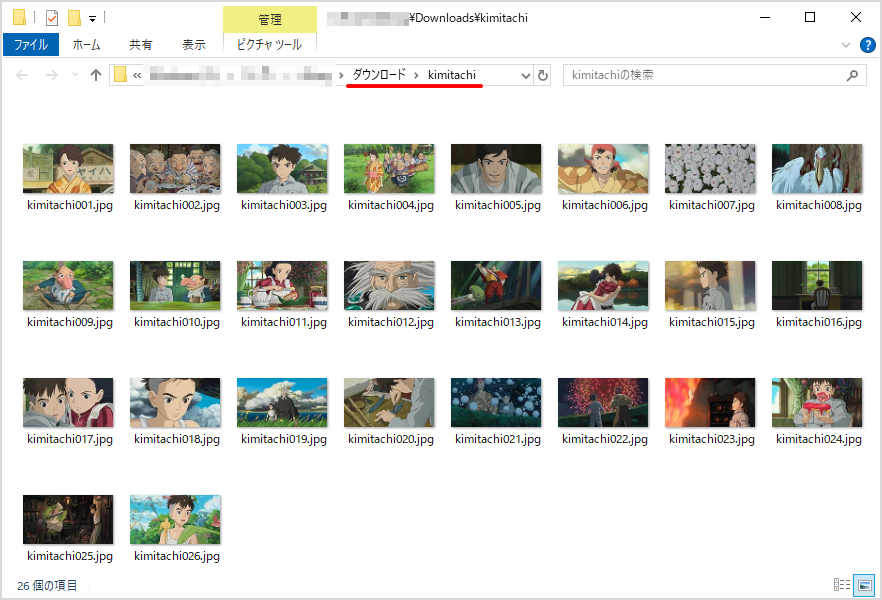 この方法を使うと、環境にもよりますが、通常は数分くらいで全作品の場面写真をダウンロードすることも可能です。