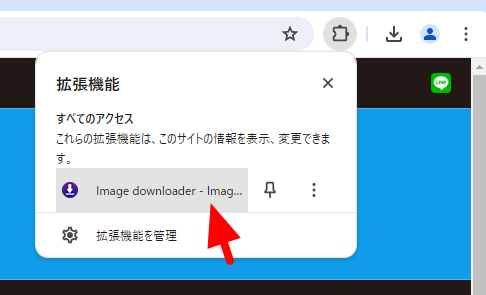 画像が配布されている作品ページを開いたら、Image Downloaderのアイコンをクリックして起動して下さい。