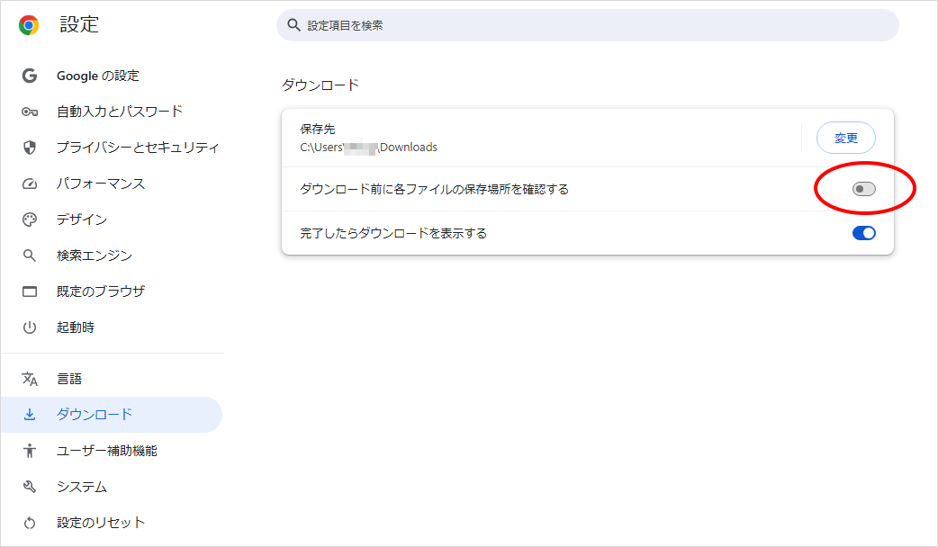 実際のダウンロード先フォルダは、ブラウザの標準ダウンロードフォルダ内の、ここで設定したサブフォルダになります(存在しない場合は作成されます)。