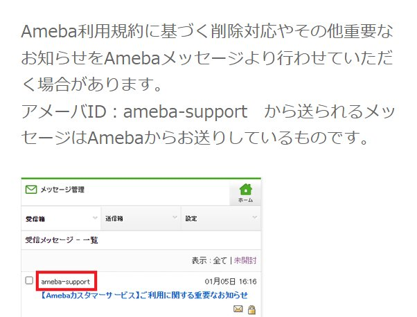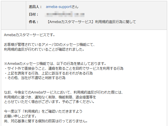 「Amebaのメッセージ機能で規約違反したことを確認しました。今後も規約違反をした場合は、通知なく機能制限や退会措置もあります。」